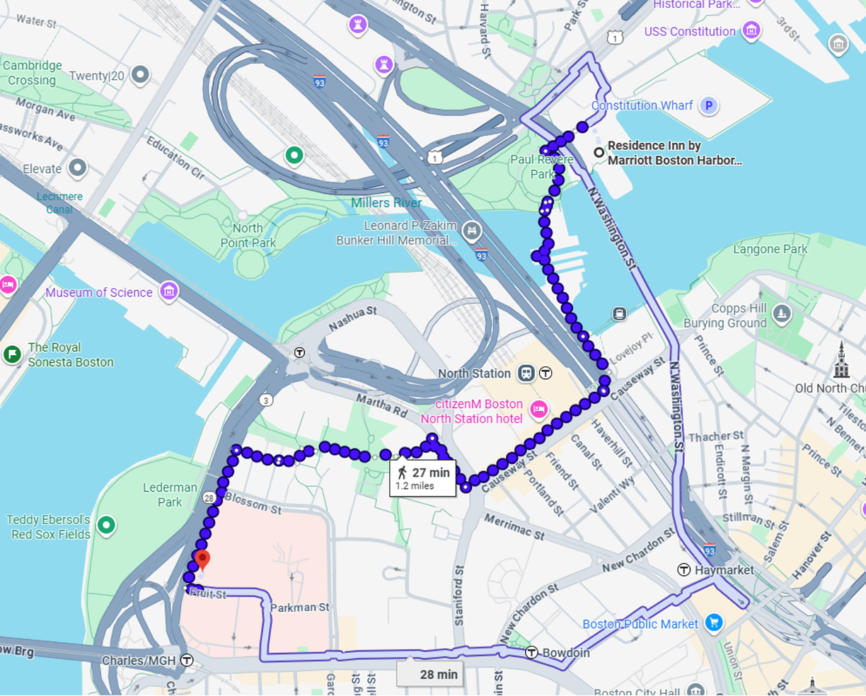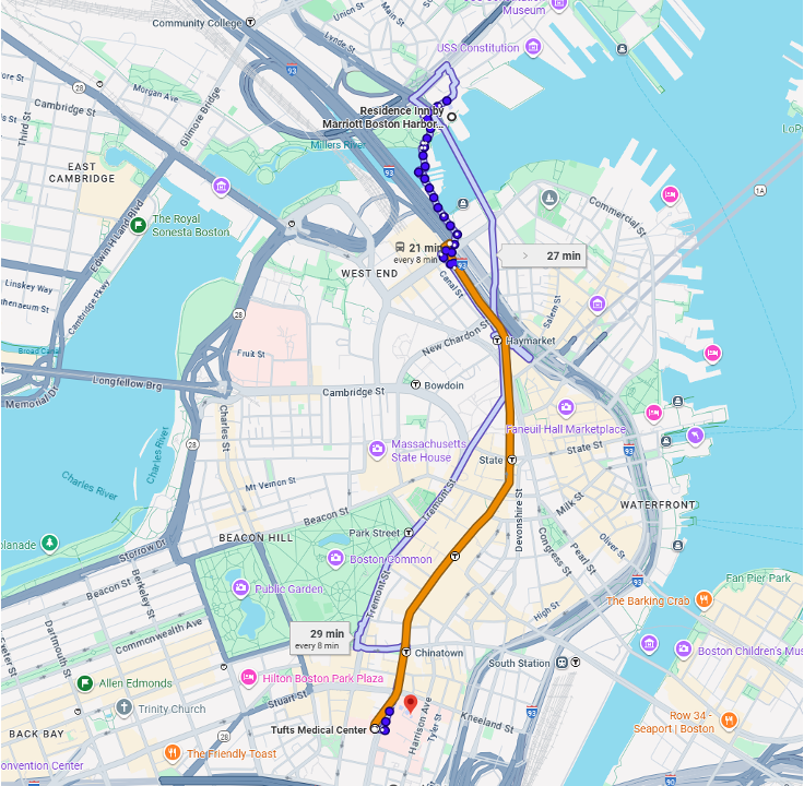 For those taking public transit (see google map images below). It is a 15 min walk to the Orange line from the residence hotel. Total trip time is 22 min by Metro and ~20 min to drive to Tufts and a 27 minute walk (no transit options) or a 11 min drive to Mass Eye and Ear.